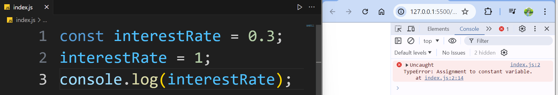 - So, when I save the changes, we're going to see an error, in the console on line 2, where we reassign