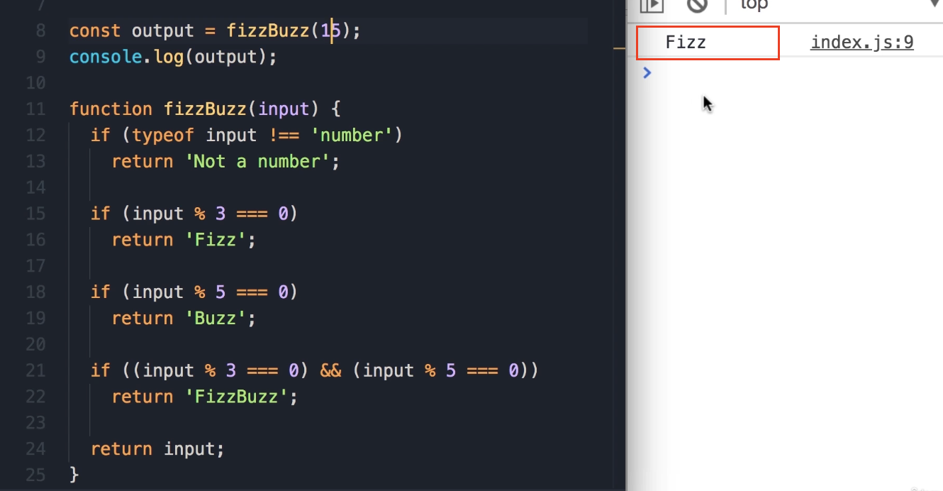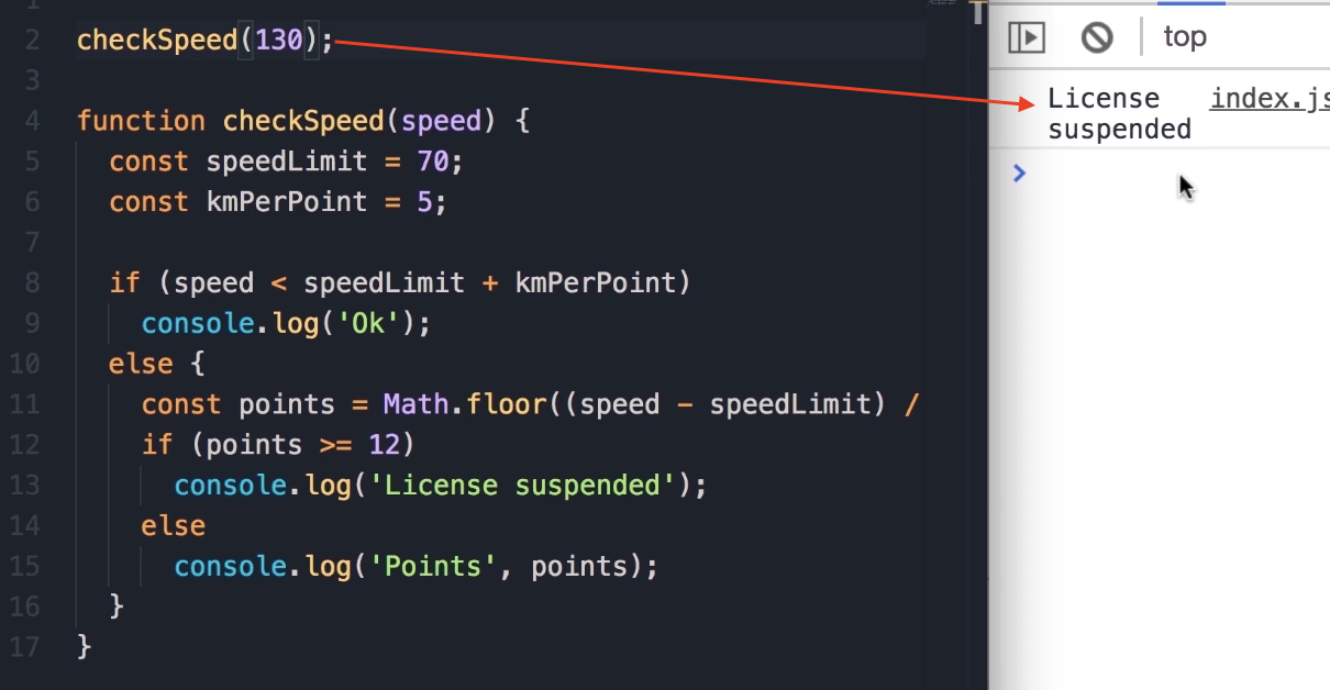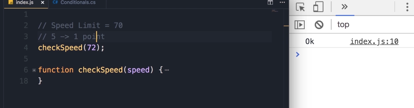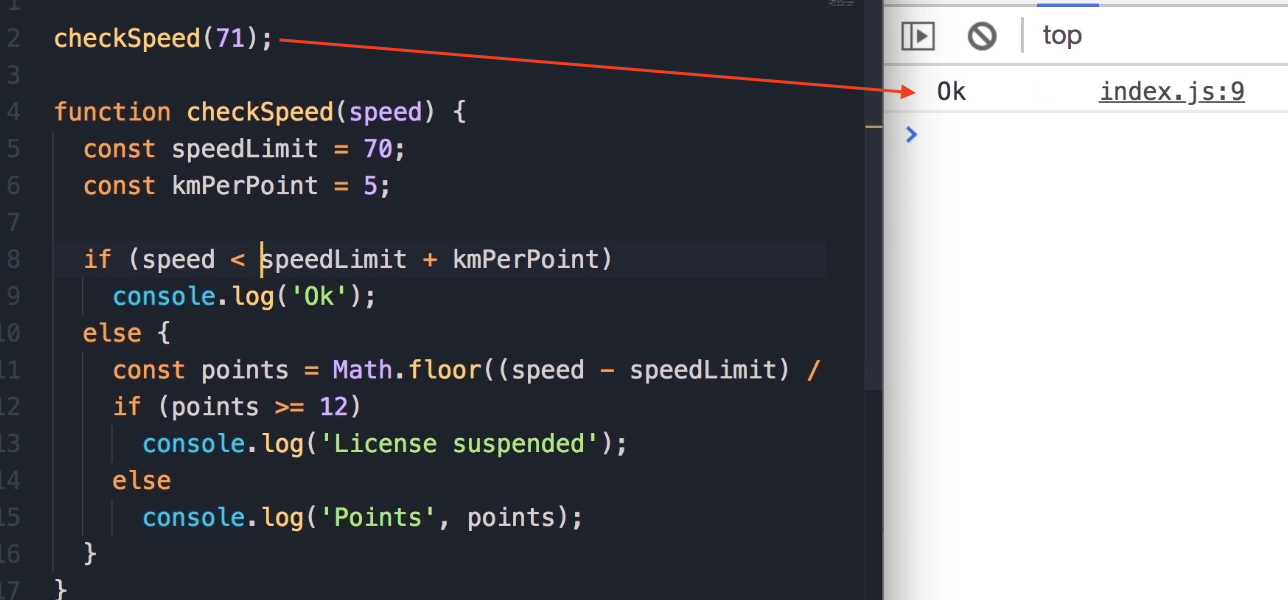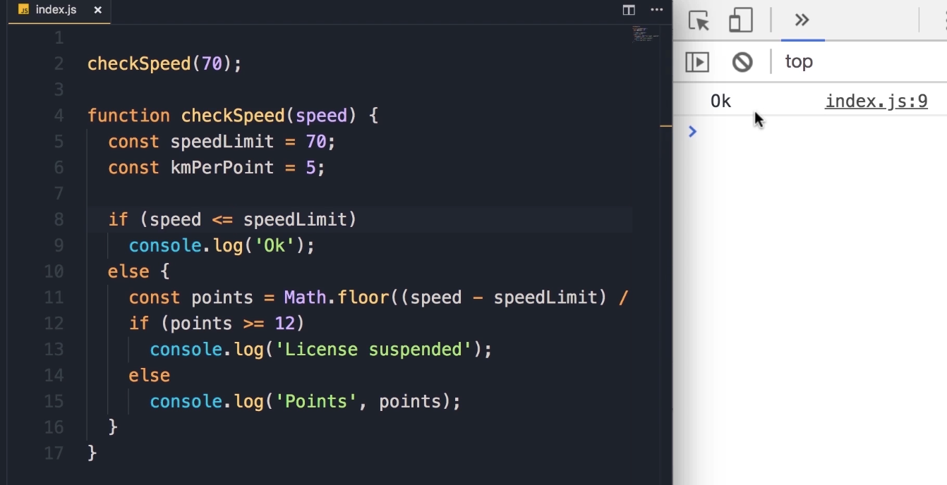 If the first condition is true, we want to display "Ok" on the console, and then return. With return, we will jump out of this function, and none of the code after it will be executed.