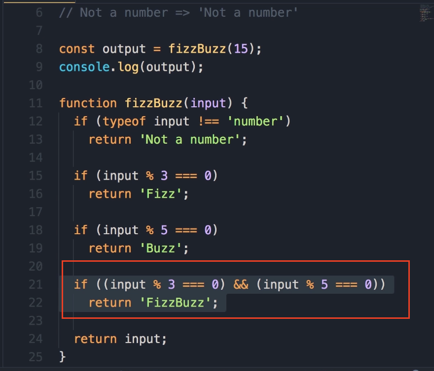 I just want to show you one more tip to make this code cleaner. Here, we have this else block, and this has caused indentation. This is not a terribly bad thing, but it's better to avoid indentation if we can (otherwise we have to scroll left and right).