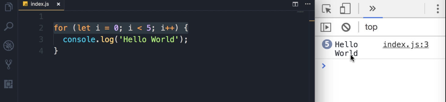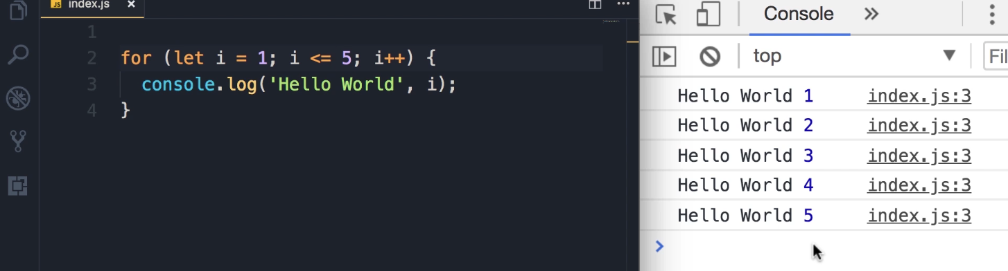 for (let i = 0; i < 5; i++) { console.log('Hello World', i); } -
