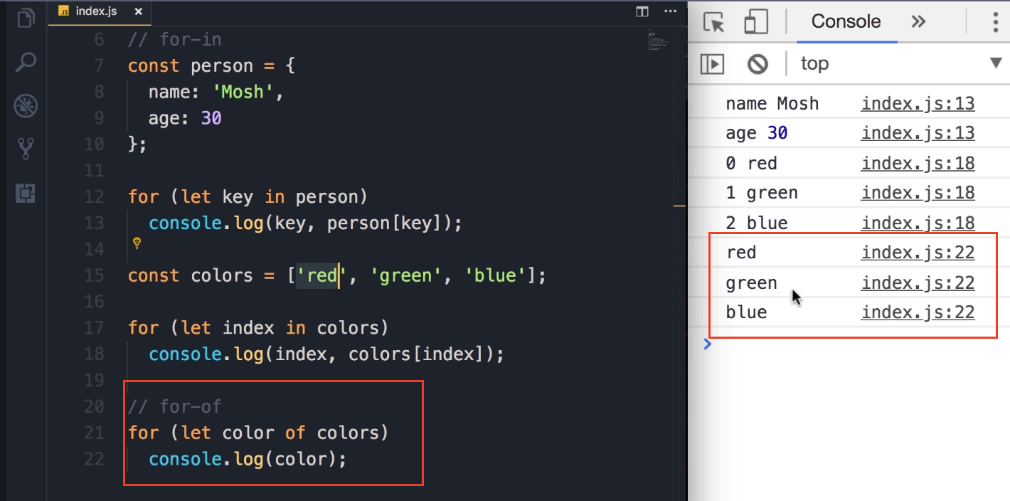 for...ofloop, we don't have to deal with the index. We don't have to access the element at a given index (e.g.,colors[index]). -