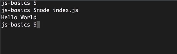 In the terminal, run Node, and pass the name of our JavaScript file, that is index.js.