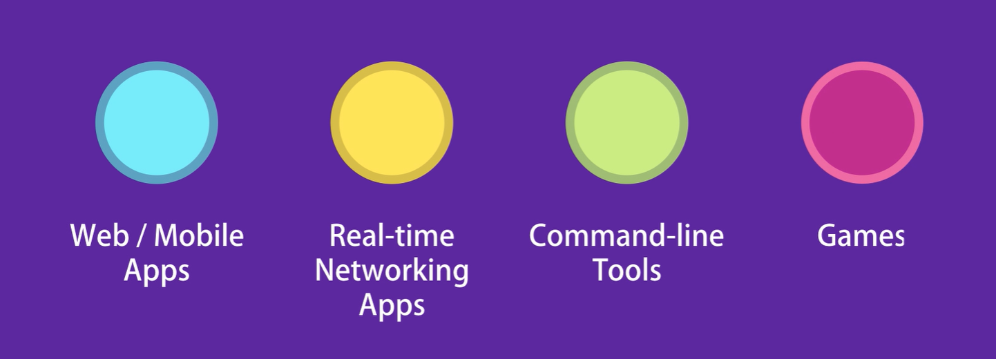 These days you can build full blown web or mobile apps as well as real-time networking apps like chats and video streaming services, command-line tools, or even games.